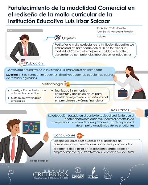 This article is based on the research focused on the redesign of the curriculum of the Institución Educativa Luis Irizar Salazar of Barbacoas, with the objective of strengthening the commercial modality. This initiative aims to improve the quality of education and to promote the development of work competencies in students. For this purpose, the qualitative paradigm was used, which is suitable for studying small groups, such as communities, schools and classrooms. From the results, it is recognized that educators play a fundamental role in the development of new ways of teaching entrepreneurship and financial and commercial areas, as well as in the way students think and act. The teacher acts in the promotion of the development of the entrepreneurial capacities of the students. In this sense, education forges the individual from his socio-cultural context, his condition and his will to build and transform the educational processes in society, hand in hand with the teacher, with the aim of facilitating the conditioning, improvement and performance of students.