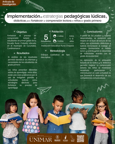 O objetivo da pesquisa foi fortalecer o processo de compreensão leitora dos alunos do primeiro ano da Escola Rural Chápala, localizada no município de Cucunubá, Cundinamarca. A metodologia adotada foi uma abordagem qualitativa descritiva. Entre os achados, ficou evidente que os alunos apresentam dificuldades no reconhecimento do alfabeto e fonemas, não têm o hábito da leitura e tampouco uma estimulação adequada para o desenvolvimento de habilidades cognitivas; portanto, não geram aprendizagem significativa. Da mesma forma, foi encontrado um baixo nível de leitura entre os alunos, o que evidenciou a necessidade de implementar estratégias pedagógicas de acordo com suas necessidades, a fim de fortalecer a compreensão leitora e, consequentemente, a aquisição de habilidades específicas para essa etapa do processo educacional. As estratégias utilizadas incluíram leitura de histórias e fábulas, workshops, uso de jogos como ferramenta didática, uso de materiais didáticos, atividades interativas mediadas por TIC e trabalho cooperativo, o que favoreceu o desenvolvimento das habilidades de leitura e permitiu melhor aprendizagem.